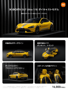 كما طرحت شاومي أيضًا نماذج مصبوبة بمقياس 1:18 من سلسلة SU7. يبلغ سعر نموذج SU7 Ultra المصغر 16,800 ين ياباني (حوالي 112 دولارًا أمريكيًا)، بينما يبلغ سعر طراز SU7 القياسي 14,800 ين ياباني (حوالي 99 دولارًا أمريكيًا).