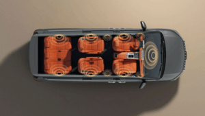 ستتوفر سيارة رويشينغ M8 بتكوينات سبعة مقاعد وتسعة مقاعد. يتميز الصف الثاني بمقعدين مستقلين مع وظائف التعديل الكهربائي ومسند الساق. واعتمادًا على مستوى التجهيزات، تشمل الميزات الإضافية طاولات قابلة للطي في الخلف، ومخرج طاقة خارجي بقدرة 2.2 كيلوواط، ونظام صوت Jamo، ووظائف التهوية والتدفئة والتدليك للمقاعد الخلفية.